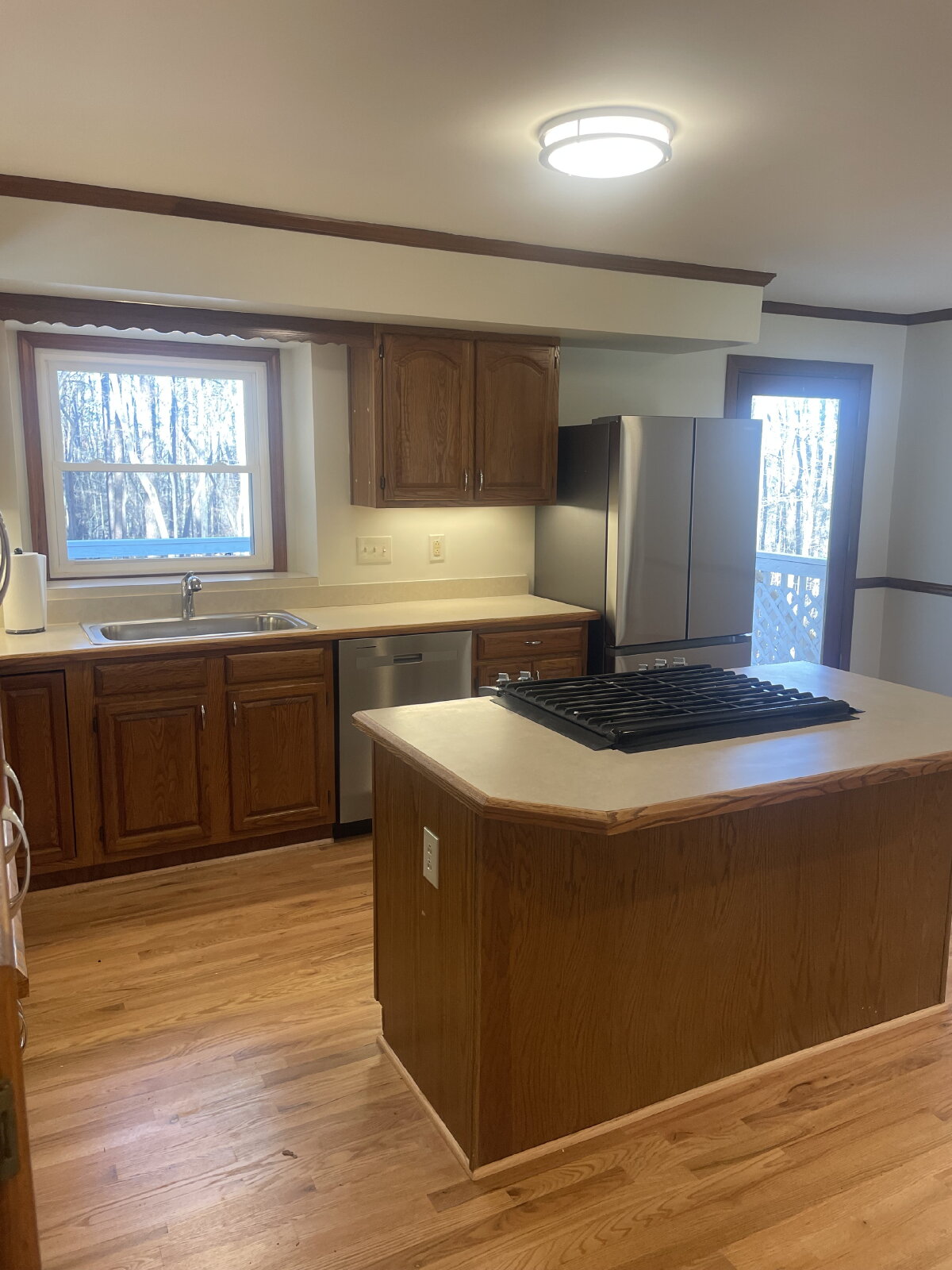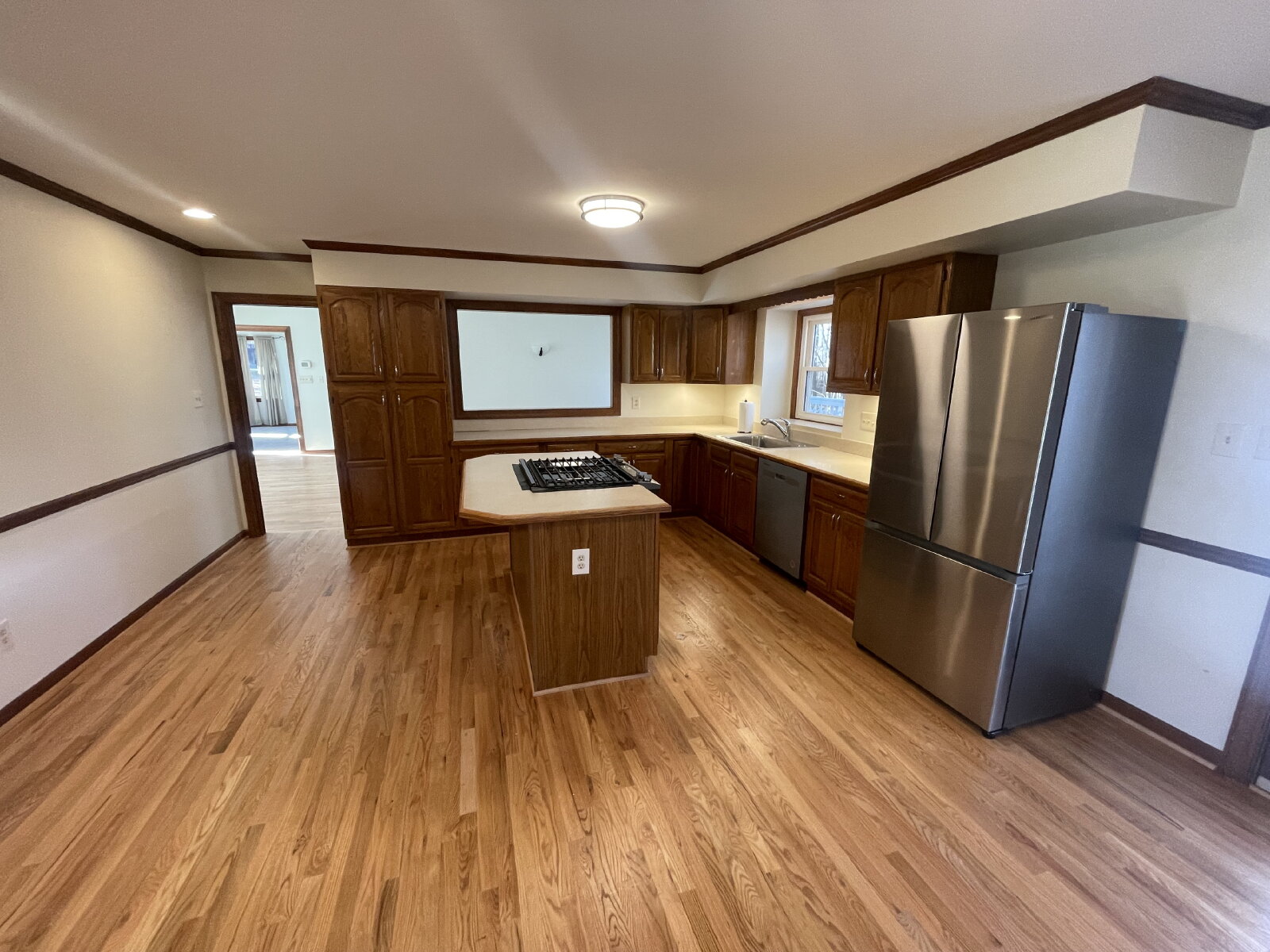 Love to cook and entertain? The spacious kitchen includes a brand new dishwasher and refrigerator and the large gas cooktop and oven are located in an island so you can interact with your family and guests while you whip up your favorite dishes. Enter the double doors to the beautiful dining room where the hardwood floors and updated lighting continue.