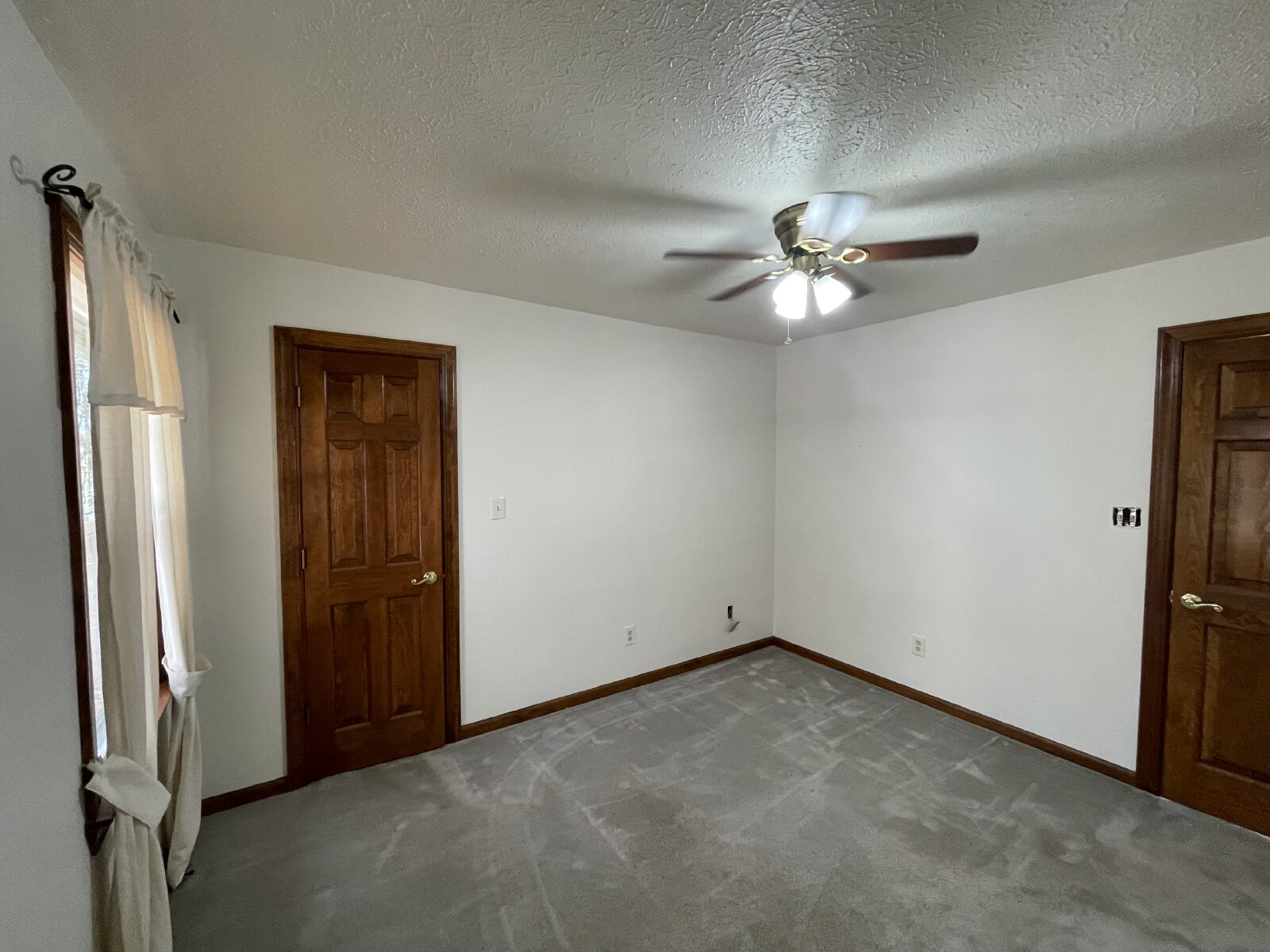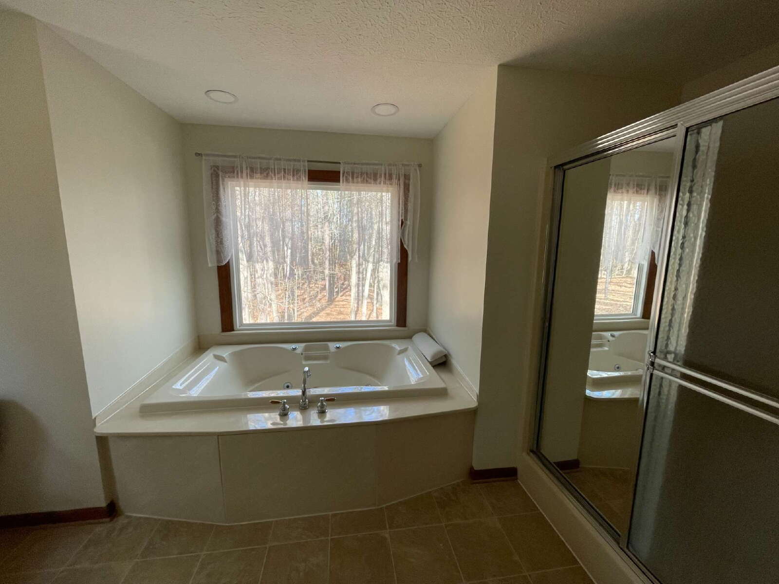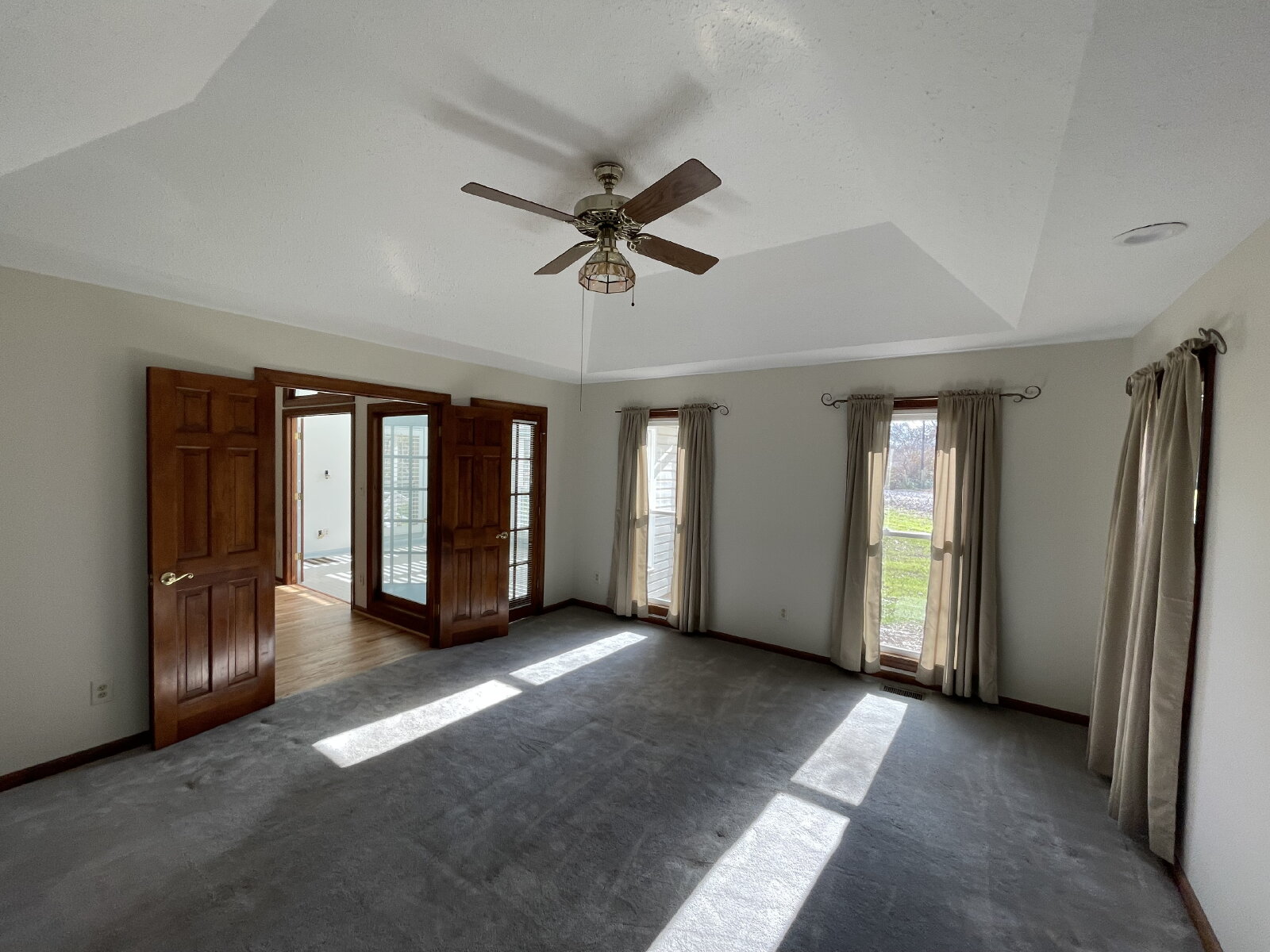 The primary bedroom is entered through beautiful double wood doors, and includes tray ceilings and spacious his and her closets. Soak the stresses of your days away in your primary suite bathroom that features a massive jetted tub situated under a picture window that looks into the tree-filled backyard.