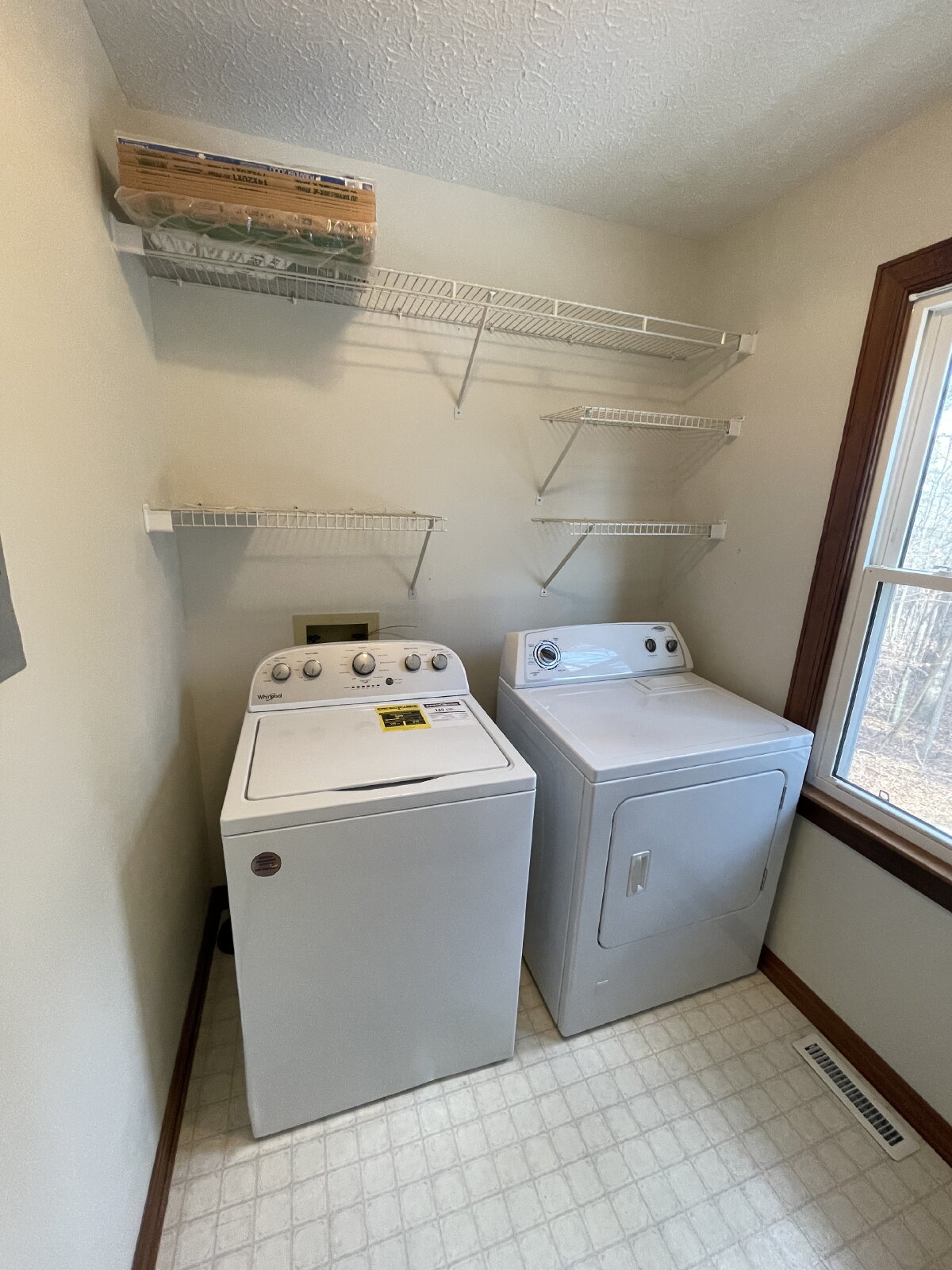 The laundry room includes a new washer and a like-new gas dryer and plenty of shelving.